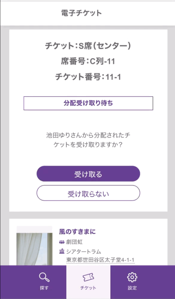 公演の同行者などから電子チケットが分配リンクが送られてきた場合、チケットを受け取ることができます。