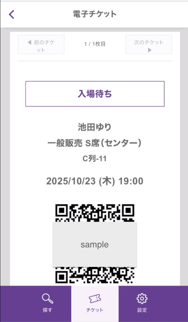 (4)「受け取る」をタップすると、チケットがご自身のアカウントに追加され、電子チケットが表示されます。
