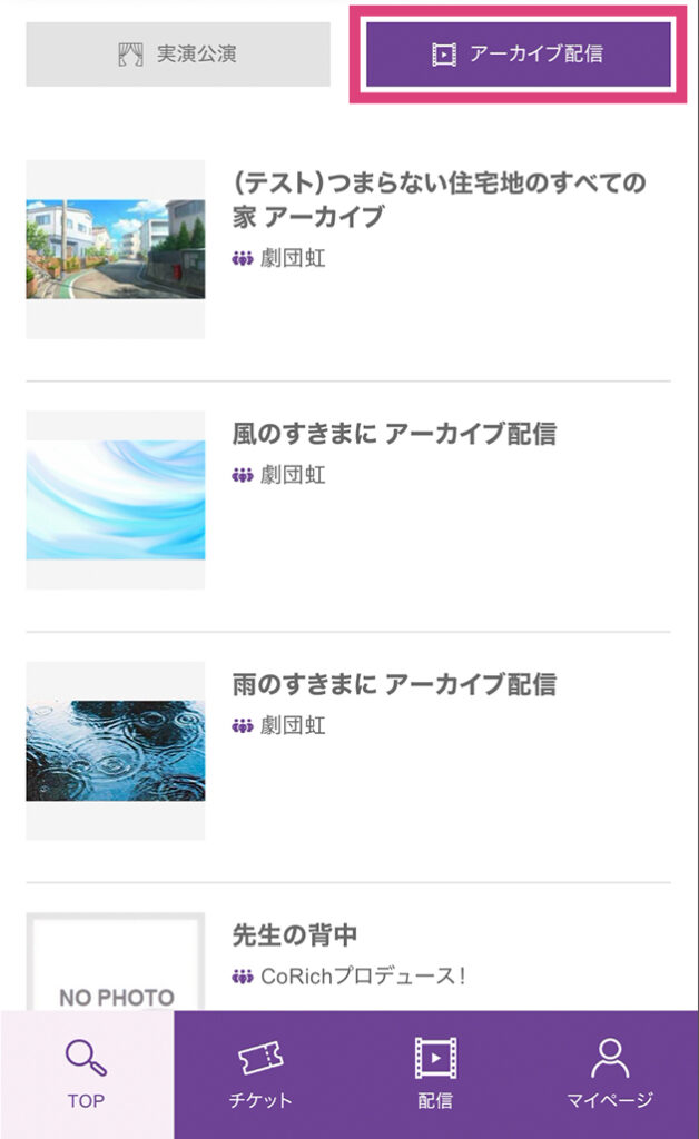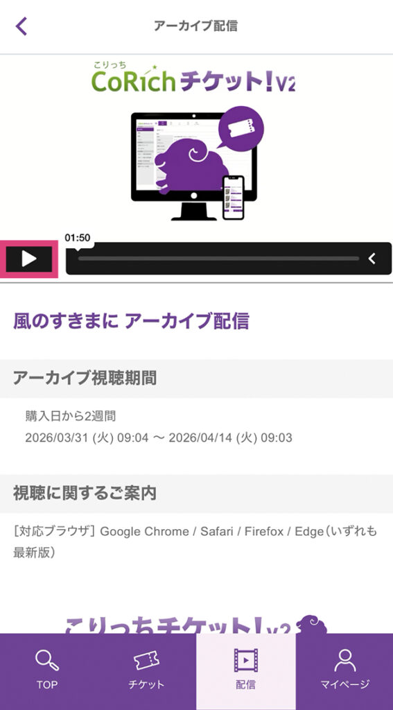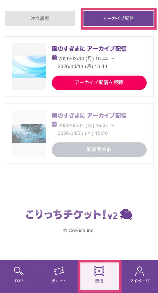 こりっちチケット!の下タブ「配信」をクリックすると、購入済みのアーカイブ配信が表示されます。