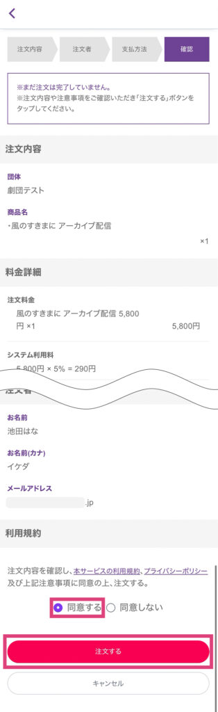 問題ないようであれば、利用規約・プライバシーポリシーの「同意する」にチェックを入れ、ピンク色の「注文する」ボタンをクリックで完了です。