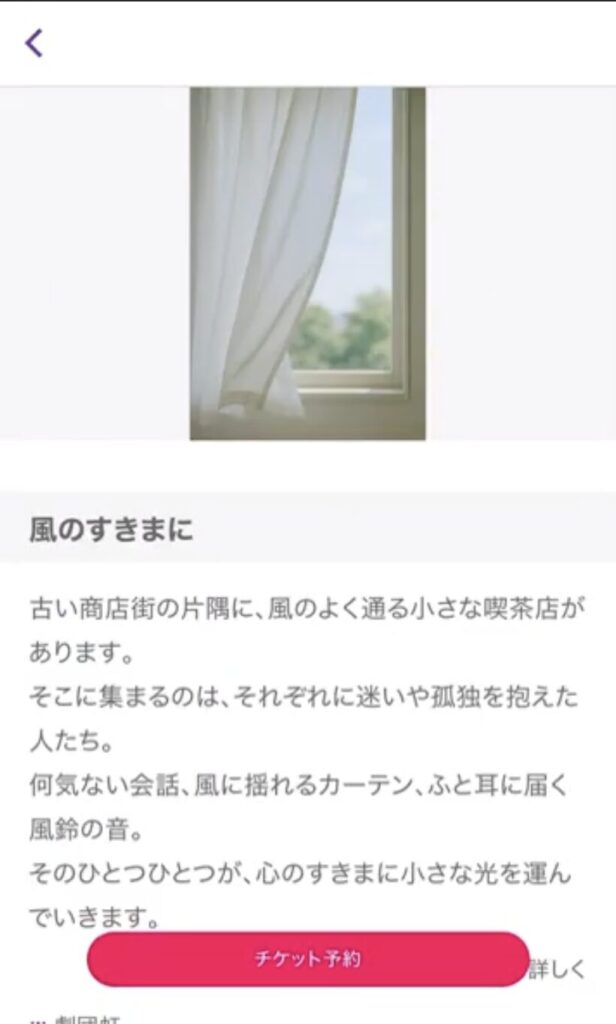 公演詳細ページでは、あらすじや公演期間などの情報を確認できます。内容を確認し、チケットを予約する場合は、ピンク色の「チケット予約」ボタンをタップしてください。