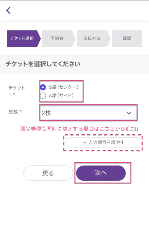 ※複数の券種を同時に購入する(S席2枚とA席2枚など)場合は、「+入力項目を増やす」のボタンをタップすると、次の券種を選択できます。