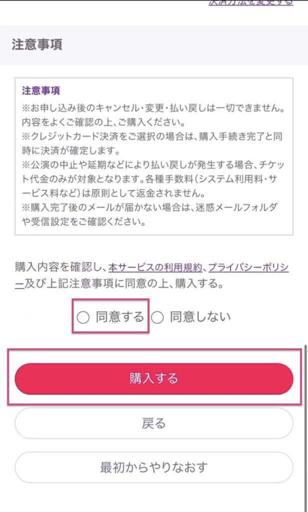 「公演名」「開催日時」「チケット枚数」「座席」「料金詳細」「購入者情報」「決済方法」など、すべての情報に間違いがないか、もう一度よくご確認ください。