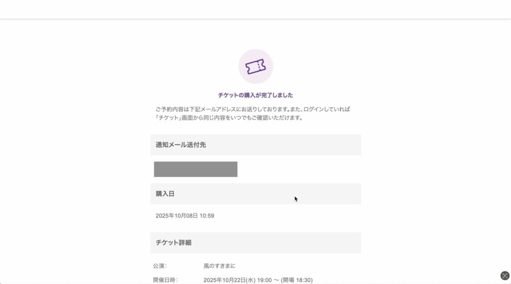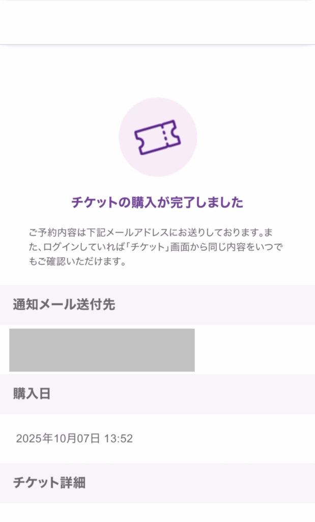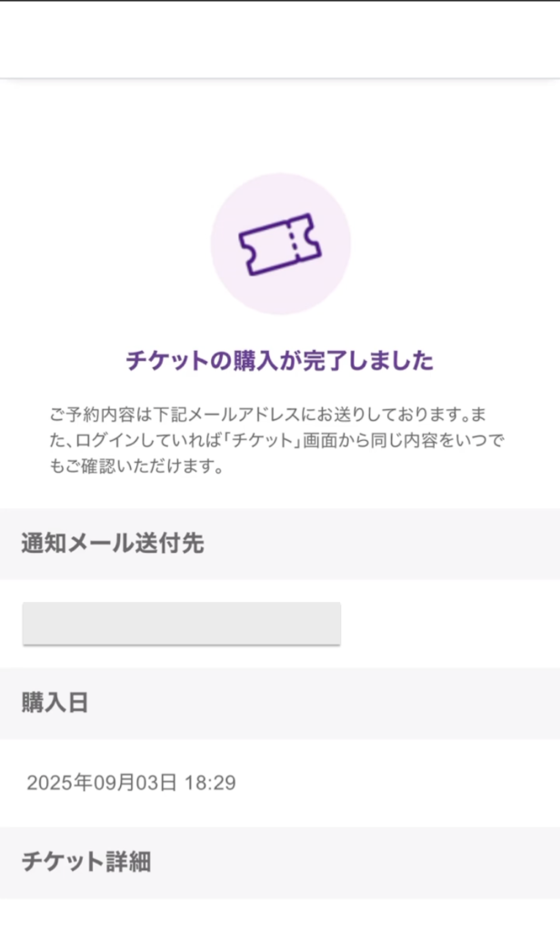 ご登録のメールアドレスに購入内容の詳細が送信されます。また、この画面からチケットの確認も可能です。