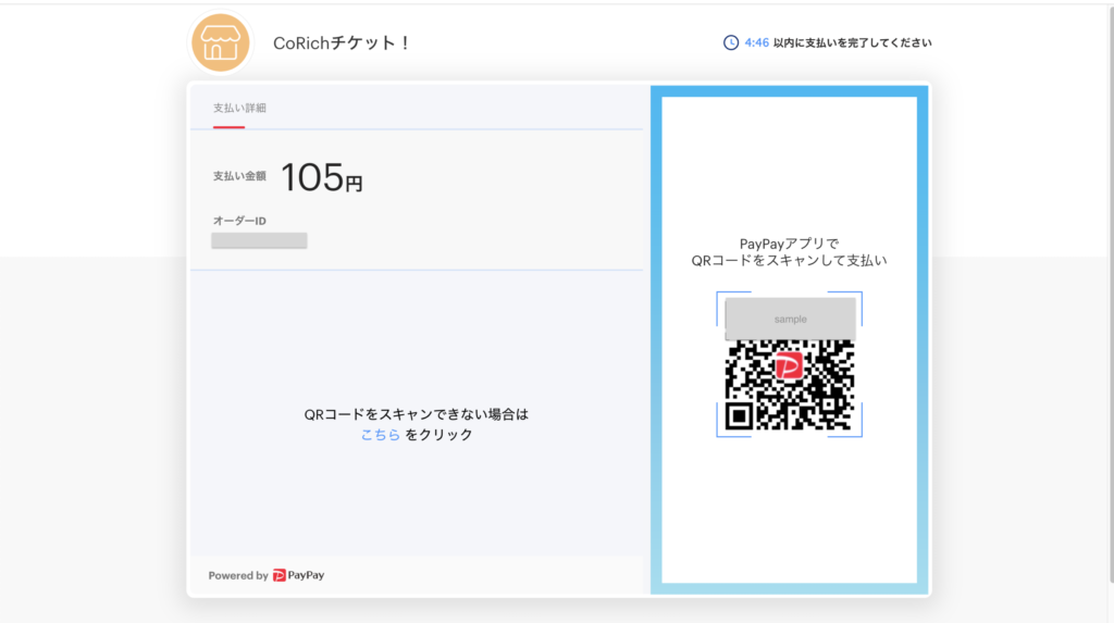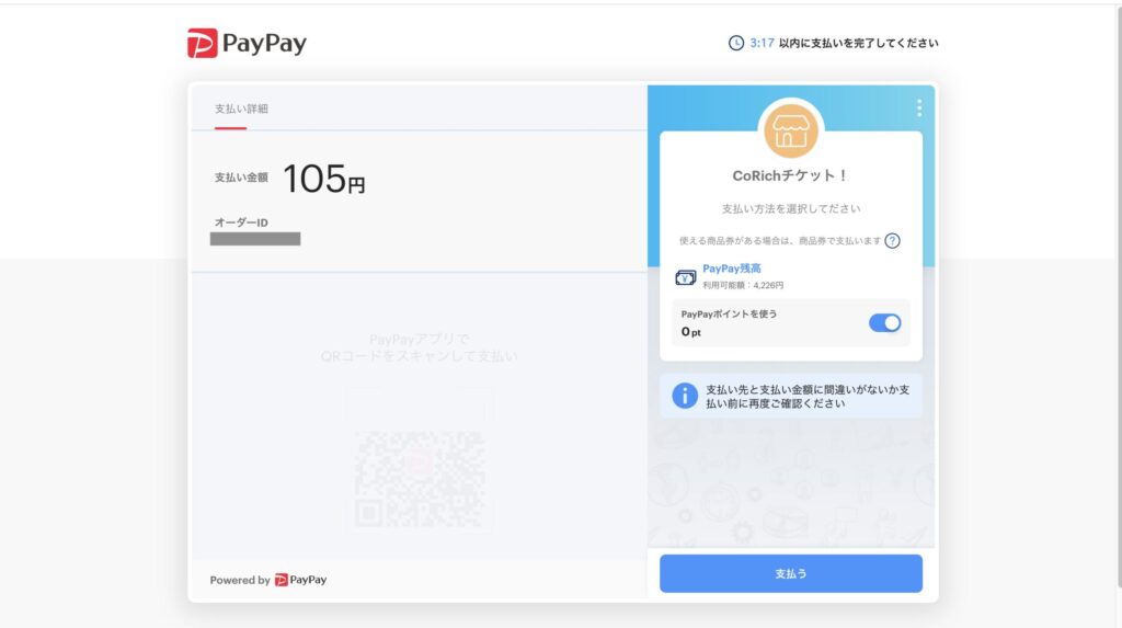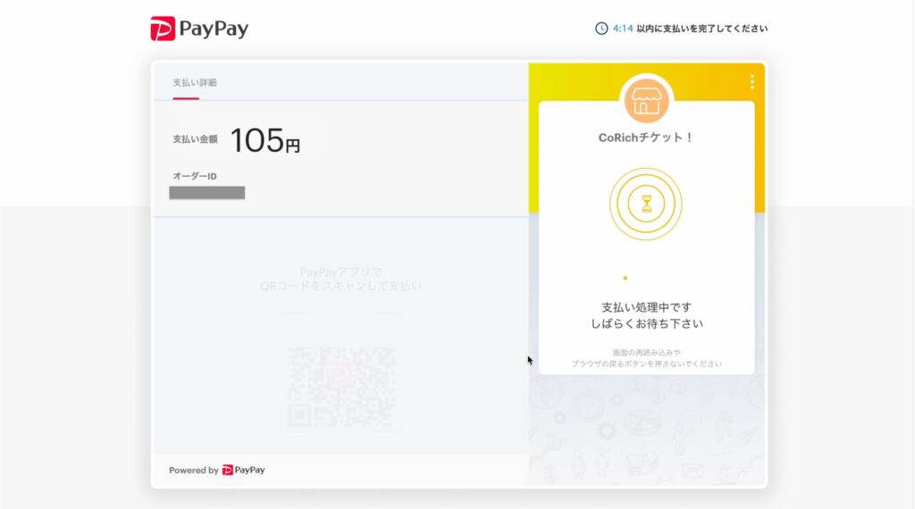 PCでPayPay支払いを選択すると、QRコードが表示されます。スマホなどでQRコードを読み取り、支払いを行ってください。
