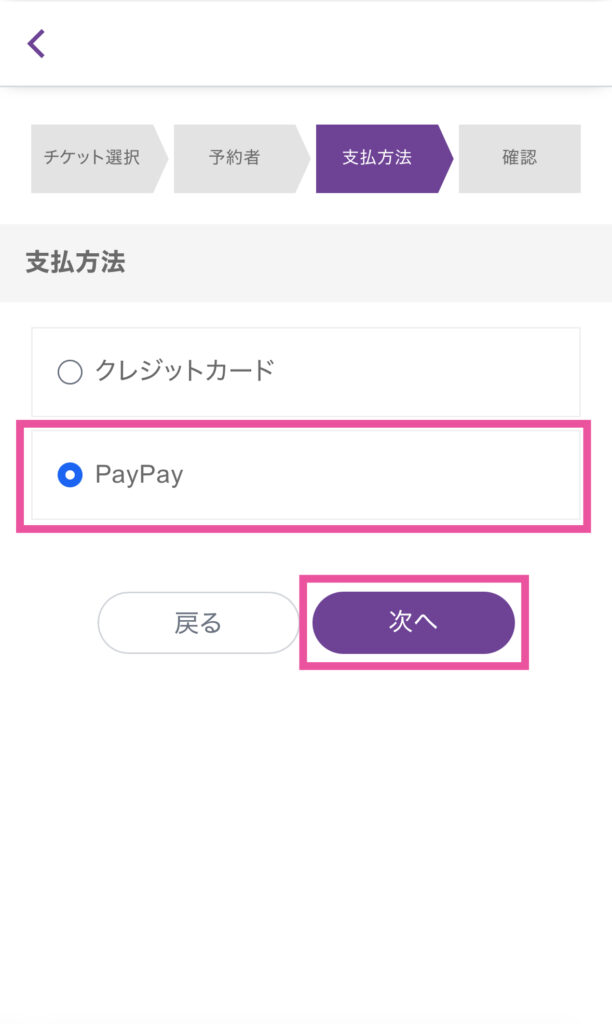 ご希望のチケットの種類(例:S席、A席など)のラジオボタンをタップします。