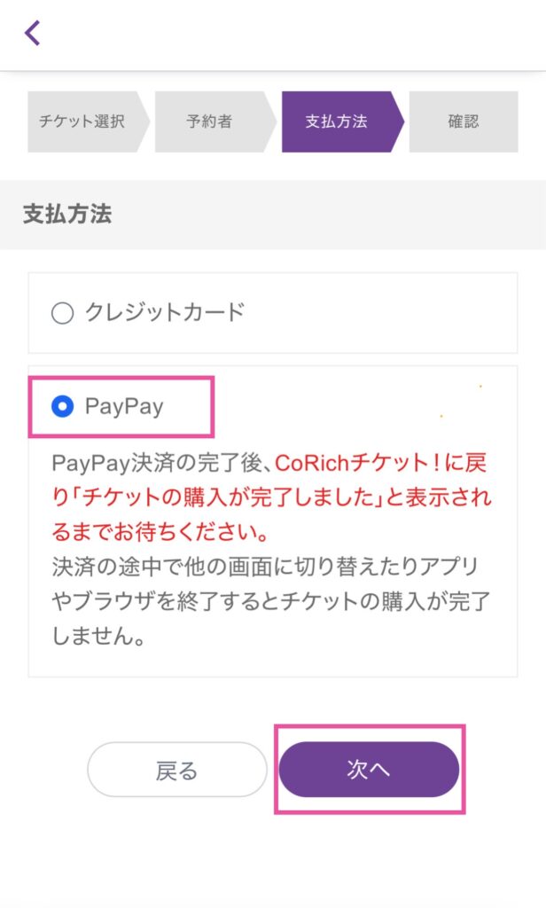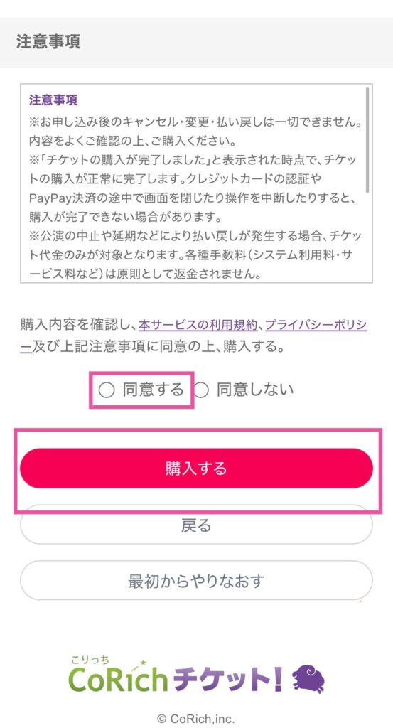 CoRichチケット!の画面で「チケットの購入が完了しました」と表示されるまで、アプリを終了したりブラウザを閉じたりしないでください。