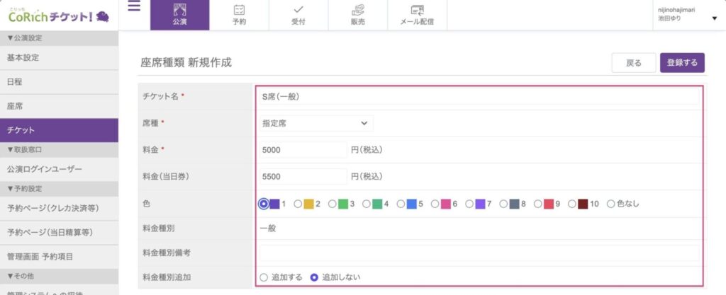 「公演設定 チケット」画面から、注意事項などを追記したいチケット名を選択