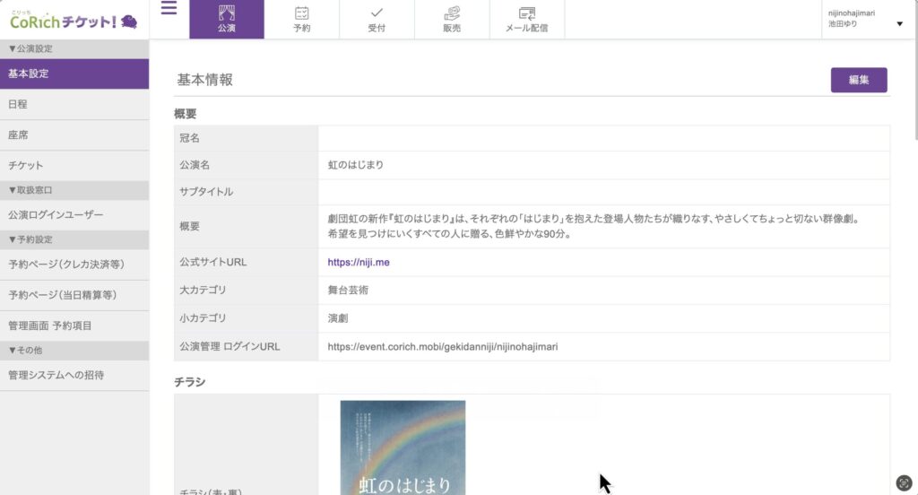 - 公演管理画面(基本設定ページ)が開くので、右上の「編集」ボタンをクリックします。