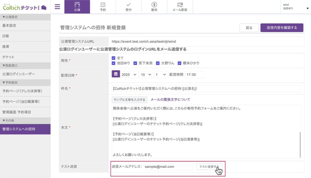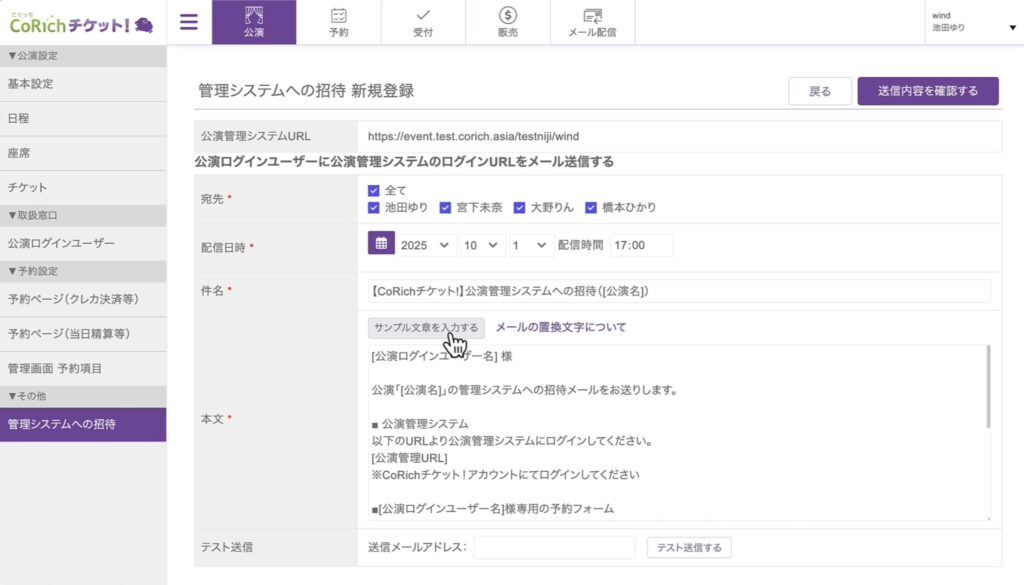 「管理システムへの招待」機能を活用すれば、公演ログインユーザーに、システムへのログインURLや、自分の取扱窓口専用のURLを知らせるメールを一括で送信することが可能です。ここでは、管理システムへの招待の手順を説明します。