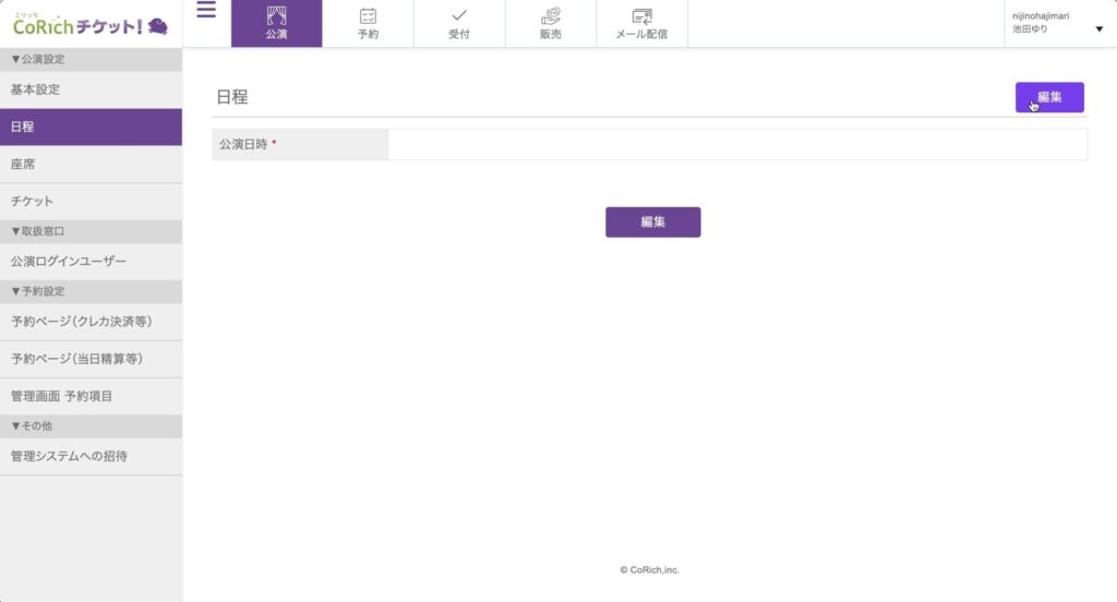 1. 公演管理画面の左側メニューから「日程」をクリックします。