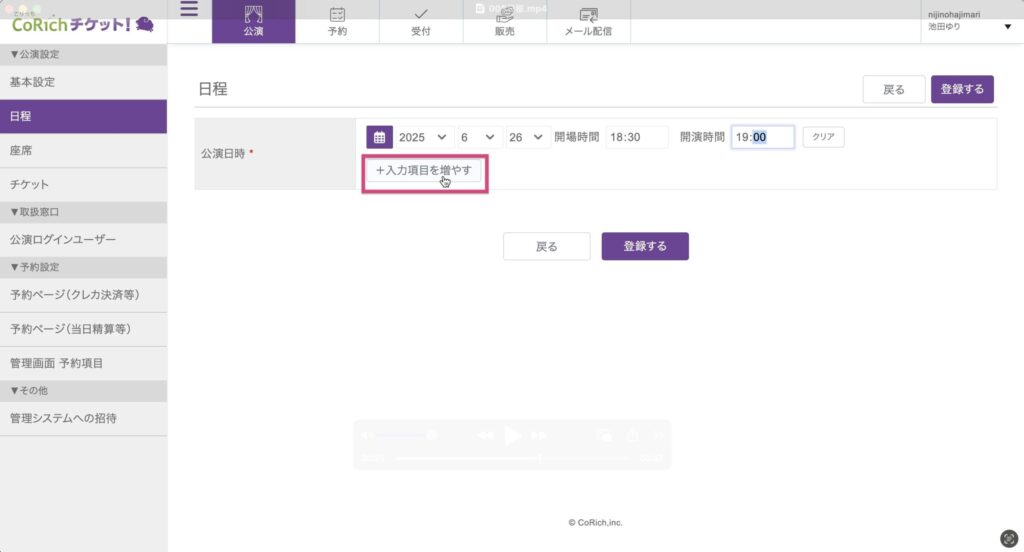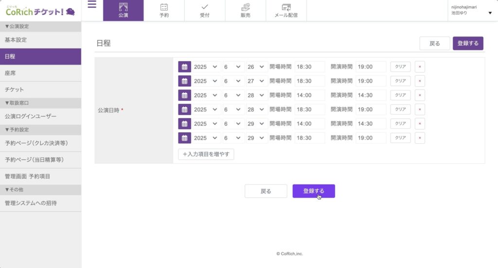 公演の基本情報を登録したら、次は「公演日程」を設定します。複数のステージがある場合でも、簡単に追加・管理ができます。このガイドでは、公演の上演日時を登録する手順を解説します。