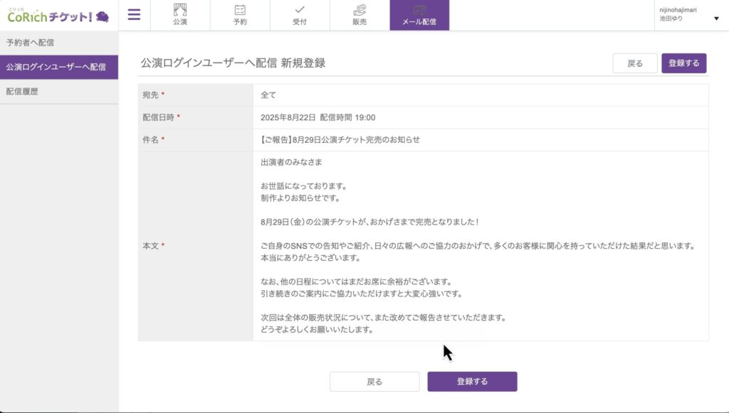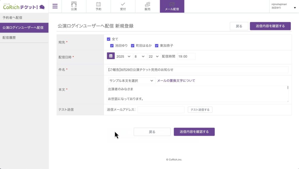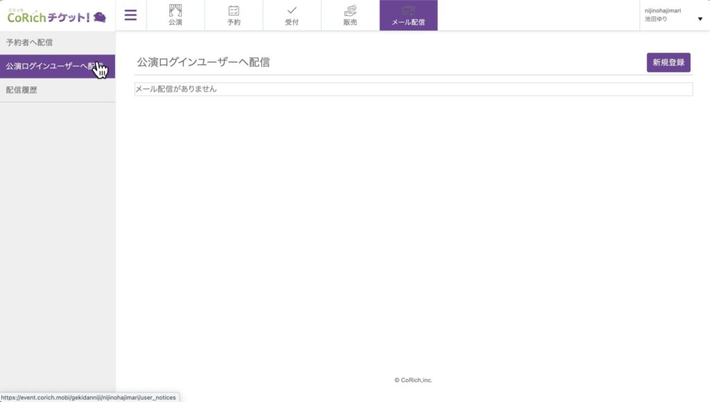 CoRichチケットでは、公演ログインユーザーとして登録したユーザーに向けても一斉にメールを送ることが可能です。このページでは、公演ログインユーザー向けのメール配信の方法を紹介します。