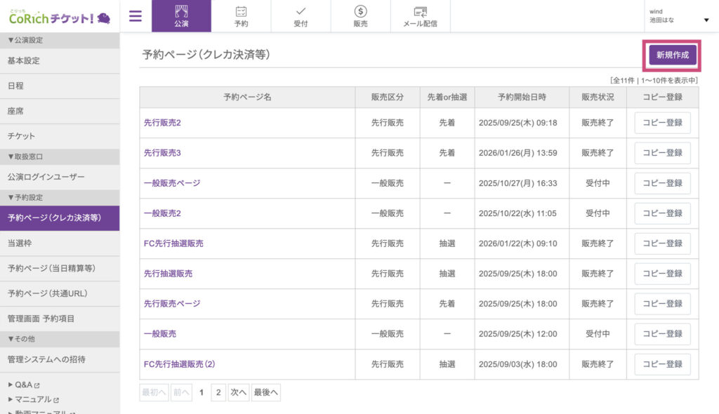 まず、CoRichチケット!の管理画面で「公演」をクリックし、左側のサイドメニューから「予約ページ(クレカ決済等)」を選択し、右上の「新規作成」ボタンを押します。