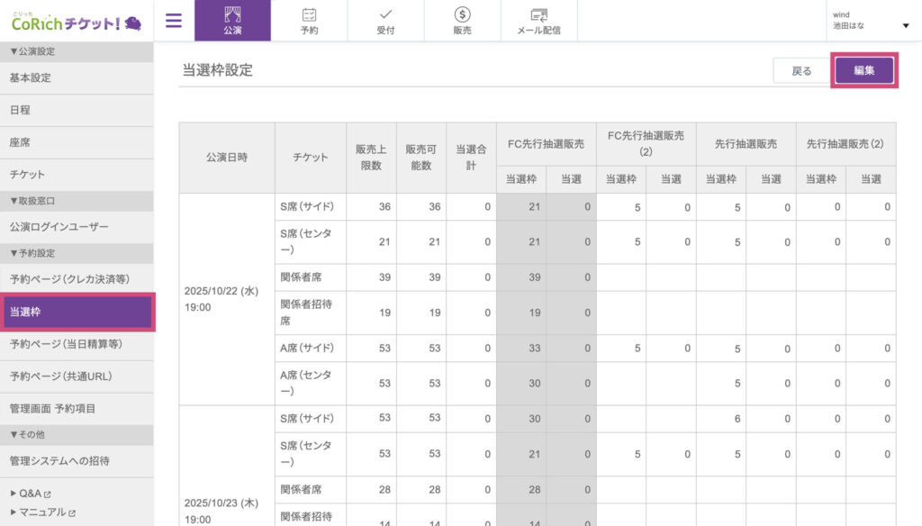 一覧画面に戻り、左メニューの「当選枠」をクリックし、右上の「編集」ボタンをクリックします。