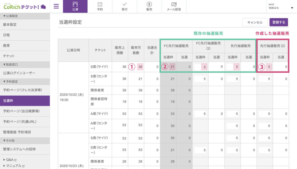 ここに入力した数が、この抽選販売で確保されるチケットの上限数となります。