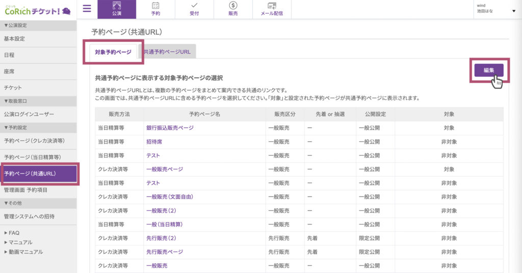 - 「対象予約ページ」タブが表示されていることを確認します。