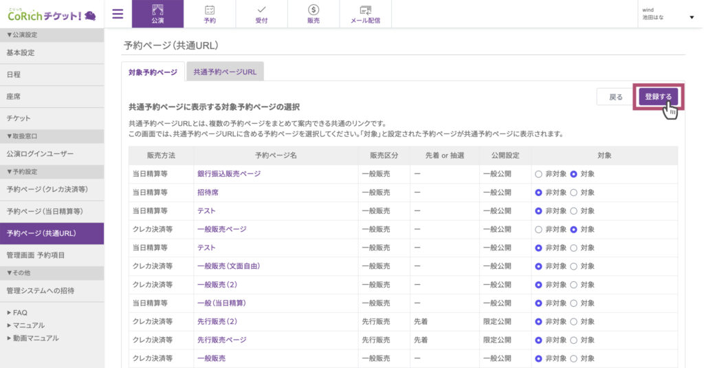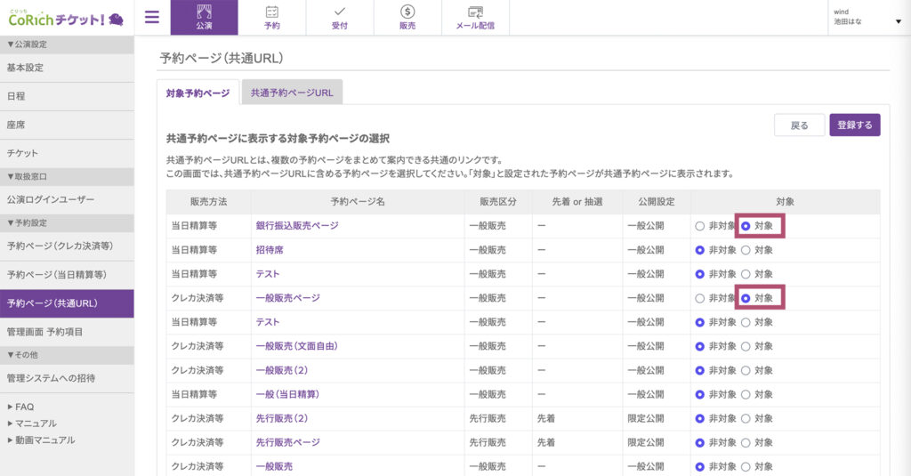 - 各予約ページ名の右側にある「対象」「非対象」の選択肢から、共通ページに表示したいものについて「対象」のラジオボタンにチェックを入れます。今回は、「銀行振込販売ページ」と「一般販売ページ」を「対象」に設定しています。