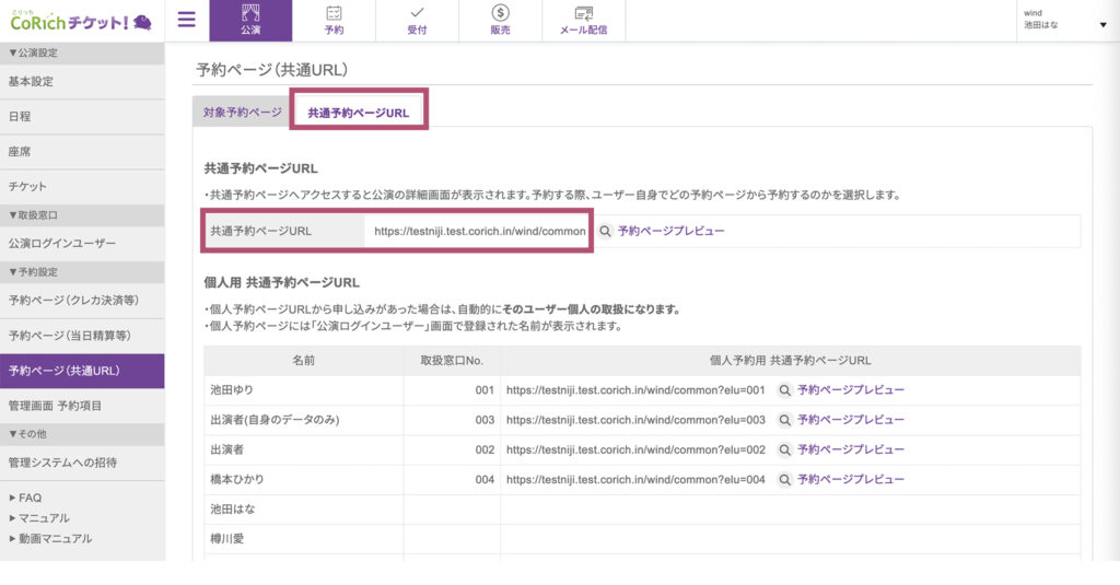 - 表示された「共通予約ページURL」が、お客様にご案内するURLです。このURLをコピーして、公演のウェブサイトやSNSなどで告知します。