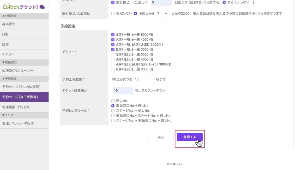 これで、当日精算・銀行振込でのチケット予約受付の準備が整いました。