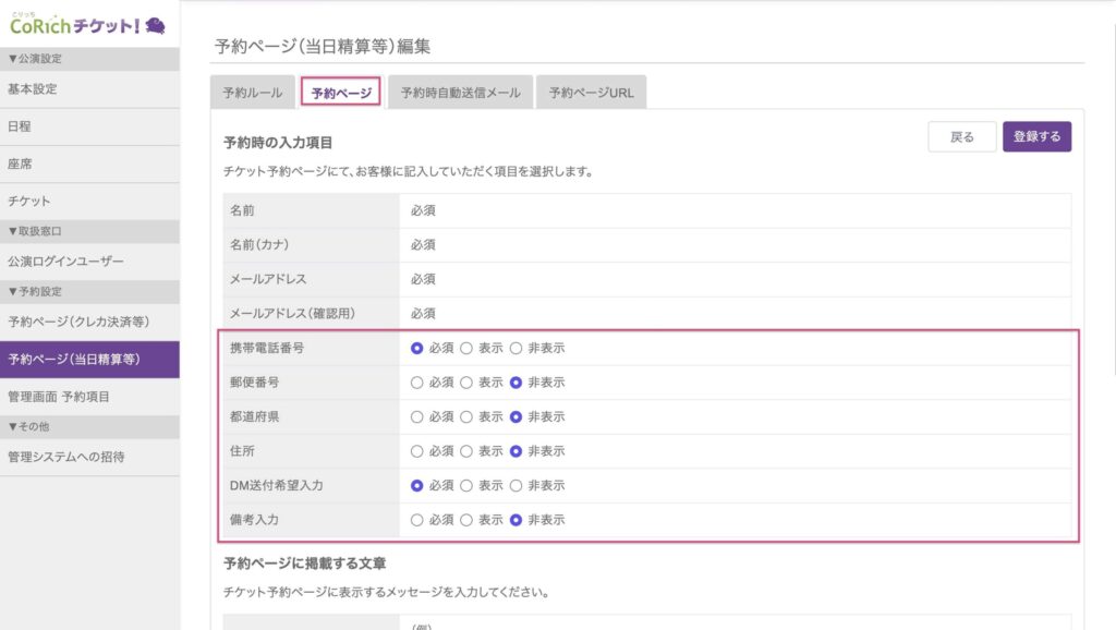 - お客様がチケットを購入する際に入力する項目(氏名、電話番号、住所など)について、「必須」「表示」「非表示」を選択します。例えば、チケットを郵送しない場合は「郵便番号」や「住所」を非表示にするなど、公演の運用に合わせてカスタマイズします。