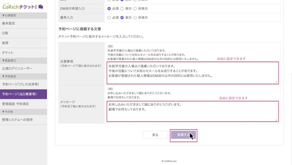 - 「予約ページに掲載する文章」で、注意事項や予約完了後のメッセージを編集します。注意事項は、お客様がチケットの予約を確定する直前に表示されます。