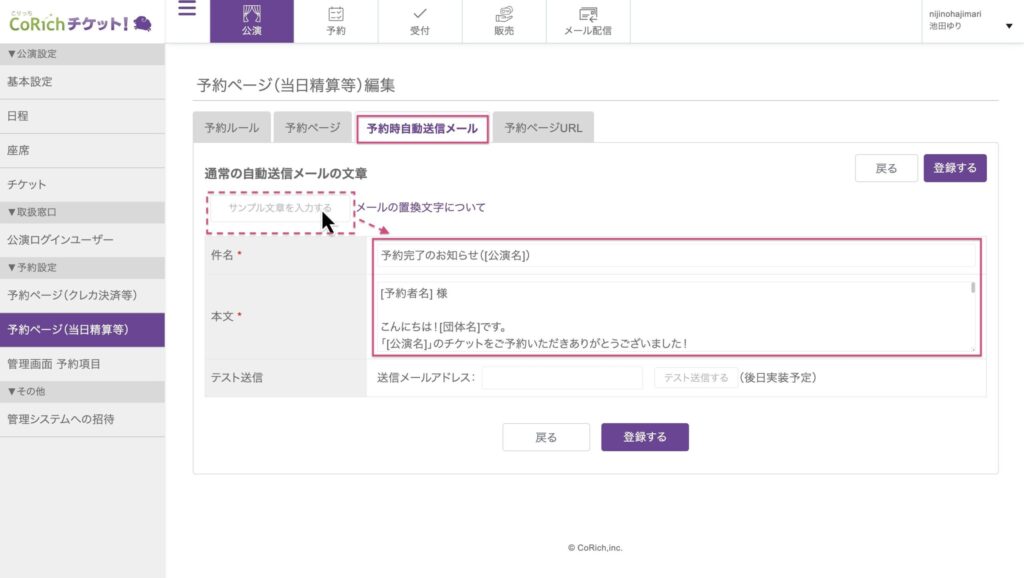 メール本文に記載する公演名やお客様の名前、チケットの予約番号等には、「メールの置換文字」が活用できます。置換文字の詳細は、画面上の「メールの置換文字について」をクリックすると表示されます。 - 編集が完了したら、「登録する」ボタンをクリックします。