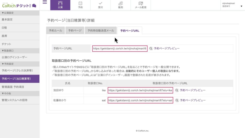 - 表示された「予約ページURL」や、必要に応じて各出演者・スタッフごとの「取扱窓口別予約ページURL」を、ウェブサイトやSNSでお知らせしてください。