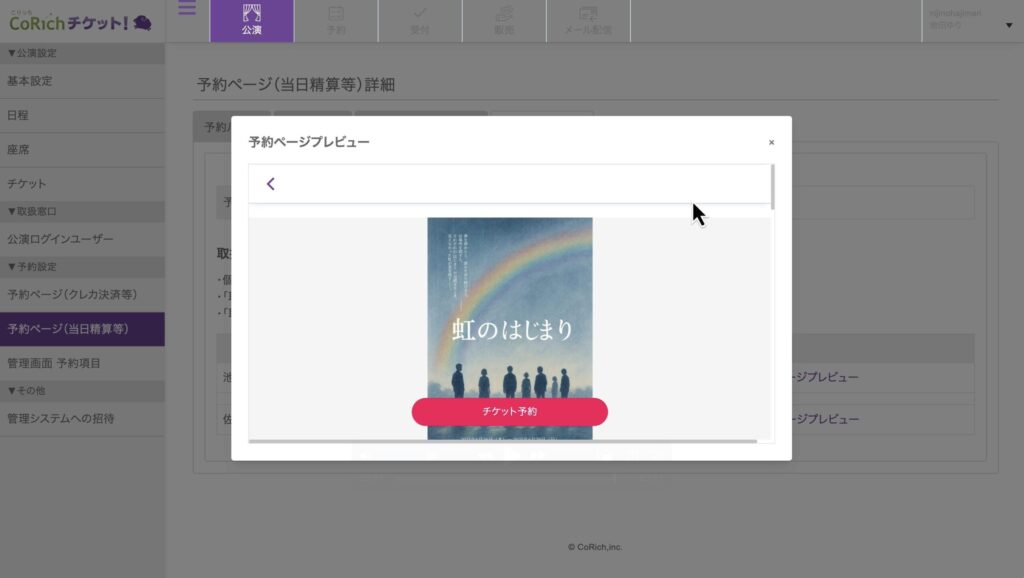 - 公演管理画面の左側メニューから「予約設定」 > 「予約ページ(当日精算等)」をクリックします。