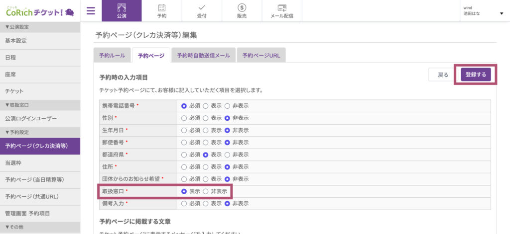 ステップ2: 予約ページタブより取扱窓口「表示」を選択する