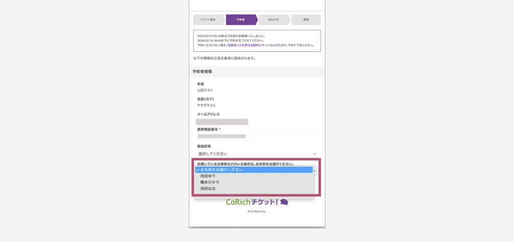チケット予約の際、それぞれの出演者ごとに個別のURLで予約ページを作成することもできますが、劇団の予約ページから、予約者が「応援している出演者」を選択して購入できるよう設定することも可能です。この設定により、出演者ごとの個別URLから購入した時と同じく、取扱窓口を別として管理することができます。