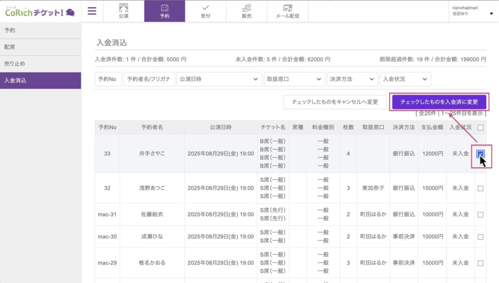 入金が確認できた予約の、右端にあるチェックボックスにチェックを入れます。そして、画面上部にある紫色の「チェックしたものを入金済に変更」ボタンをクリックします。