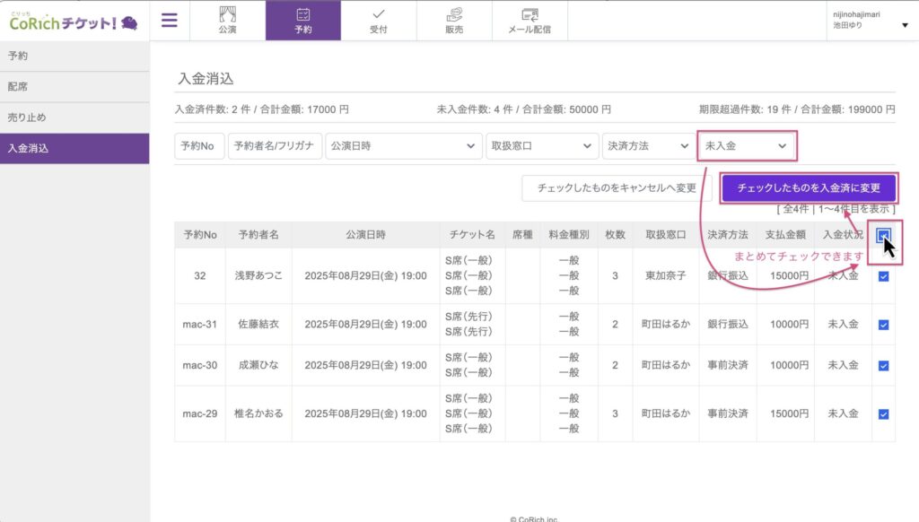 また、画面上部には「入金済件数」「未入金件数」とその合計金額も常に表示されているため、公演全体の入金状況も一目で把握できます。