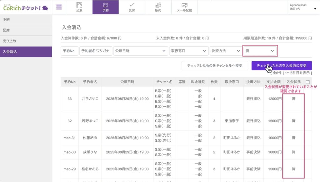 正しく処理できたかを確認したい場合は、画面上部の「入金状況」フィルターを「済」に変更してみてください。先ほど処理した予約が「入金済」として表示されているはずです。