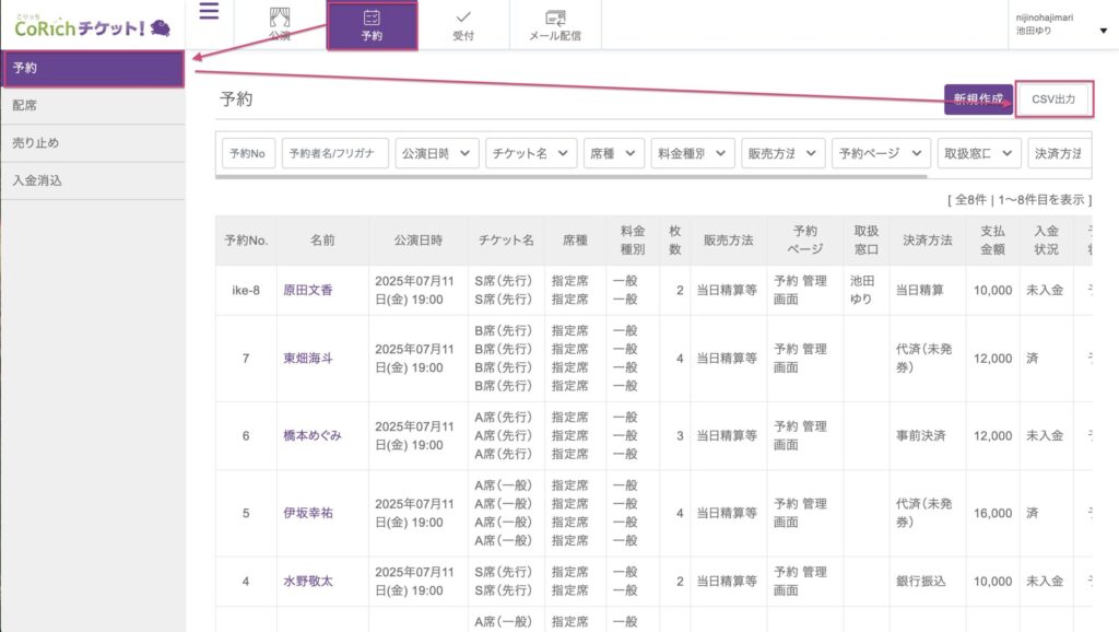 CSVファイルには、予約番号、予約日時、お客様の名前、連絡先、チケットの種類、支払状況など、管理画面で確認できる全ての情報が含まれています。当日の受付リスト作成や、入金管理、顧客分析など、様々な用途にご活用ください。