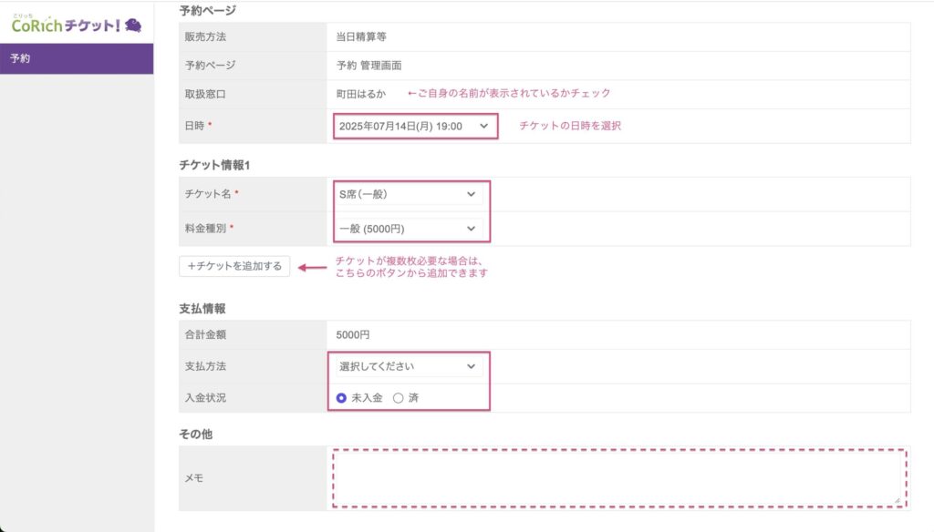 予約ページの部分に、「取扱窓口」に自分の名前が表示されているか確認します。また、予約するチケットの日時を選択します。