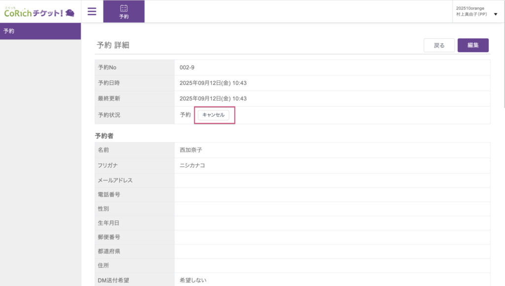 1)予約情報の一覧から、キャンセルしたい予約者の名前をクリック