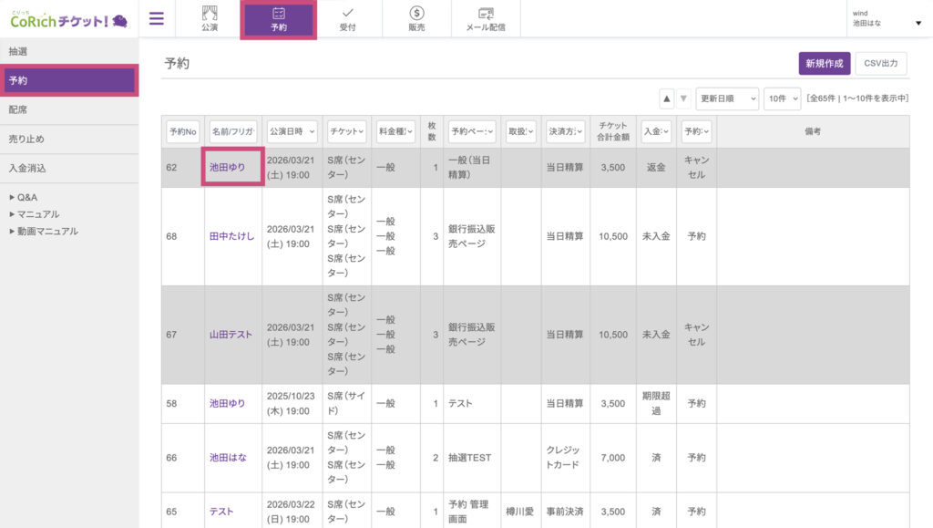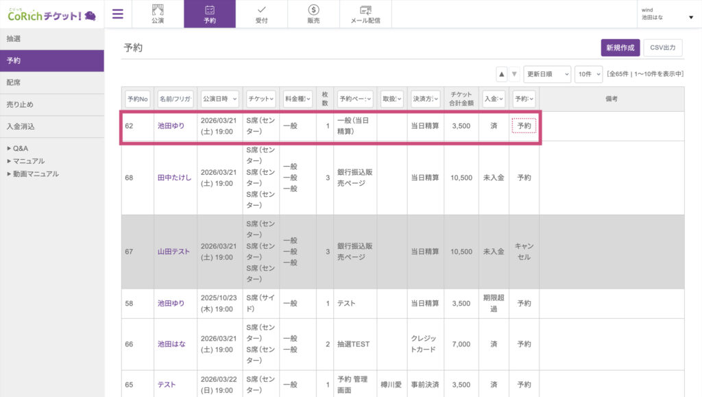 予約一覧画面に戻ると、ステータスが「キャンセル」から「予約」に変わっていることが確認できます。