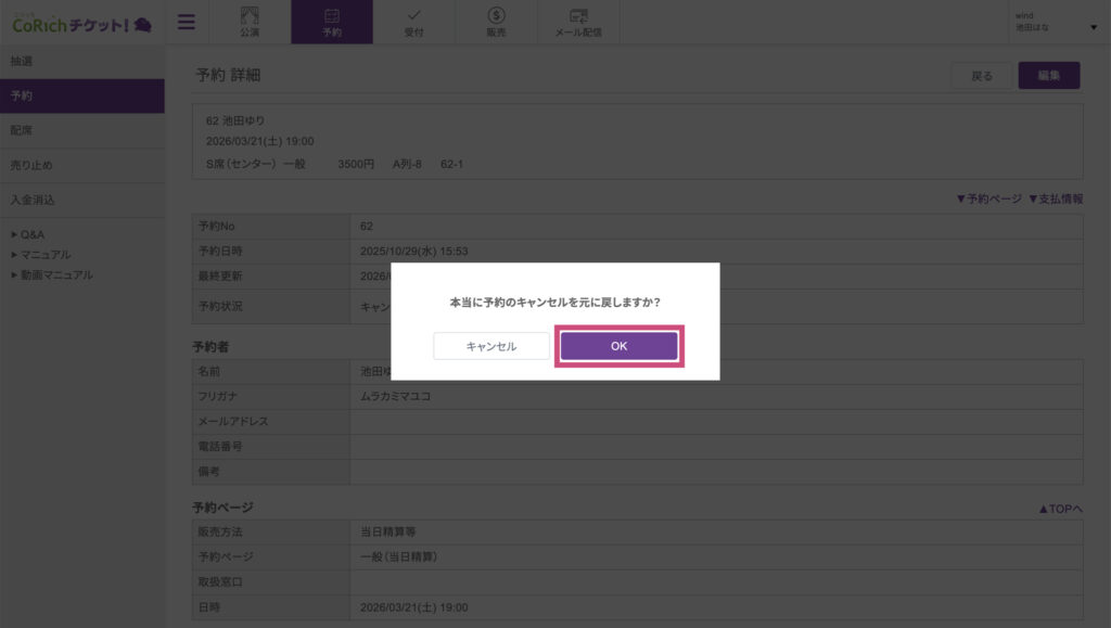 「本当に予約のキャンセルを元に戻しますか?」という確認メッセージが表示されるので、「OK」ボタンをクリックします。