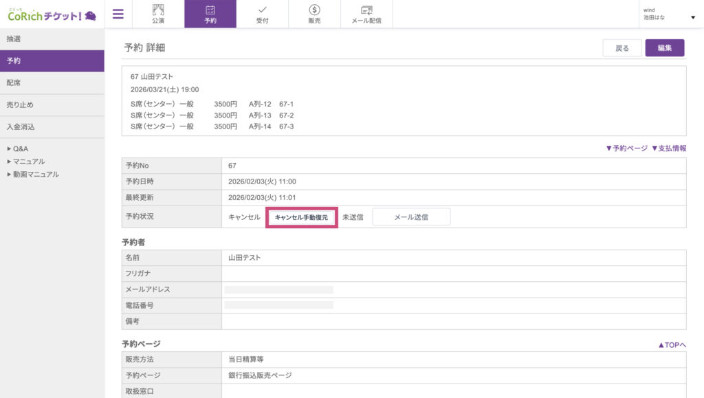 「予約状況」の項目に表示されている「キャンセル手動復元」ボタンをクリックします。