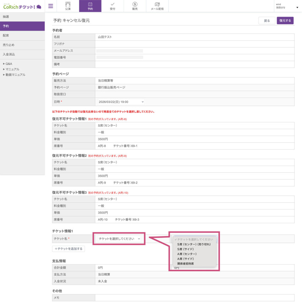 キャンセルした予約の座席に別の予約が入ってしまった場合や、チケットの残数が不足している場合は、元の座席に復元することができません。この場合、手動で別の座席を確保し直す必要があります。