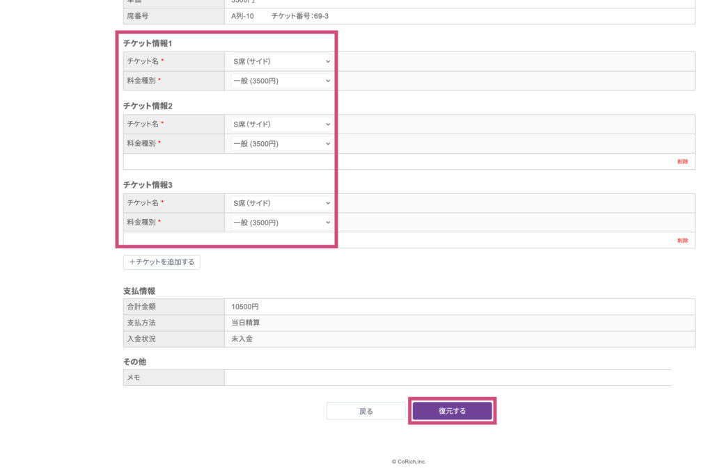 元の画面に戻り、「チケット情報」の項目に新しく選択したチケット名が反映されていることを確認します。問題がなければ、ページ最下部の「復元する」ボタンをクリックして、操作は完了です。