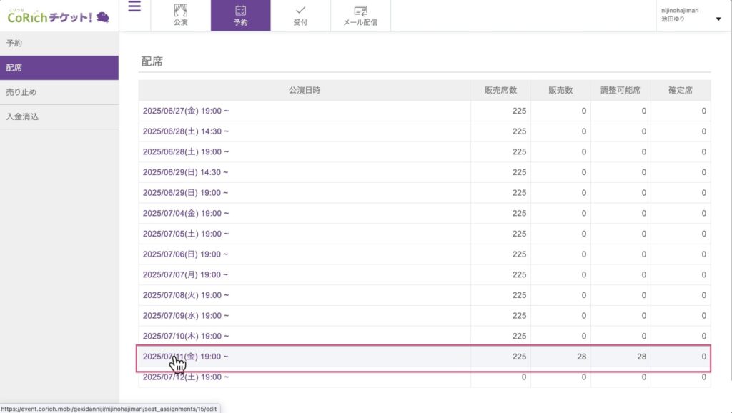 - 公演日時の一覧が表示されるので、配席を行いたいステージの行をクリックします。