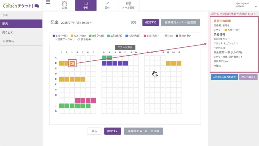 - 座席表の各マスをクリックすると、右側の「選択中の座席」エリアにその席を予約したお客様の情報(名前、予約番号、チケット枚数など)が表示されます。