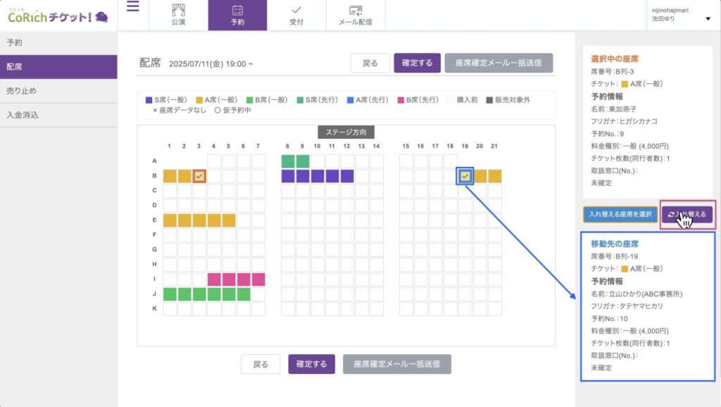 お客様の要望や主催者側の都合で座席を入れ替える場合は、以下の手順で行います。