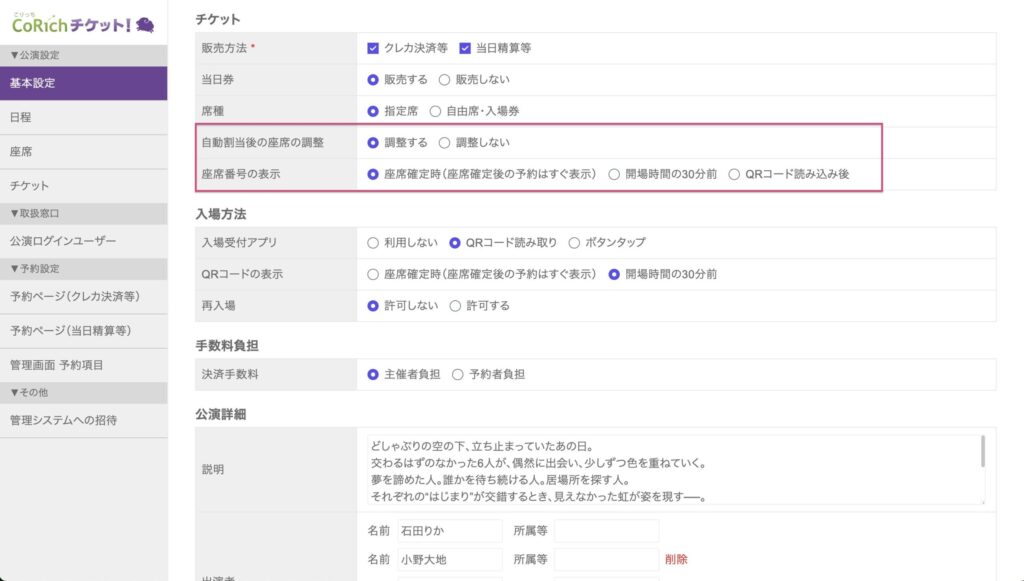 ステップ0: 公演基本設定で、座席の調整をする設定になっているか確認する