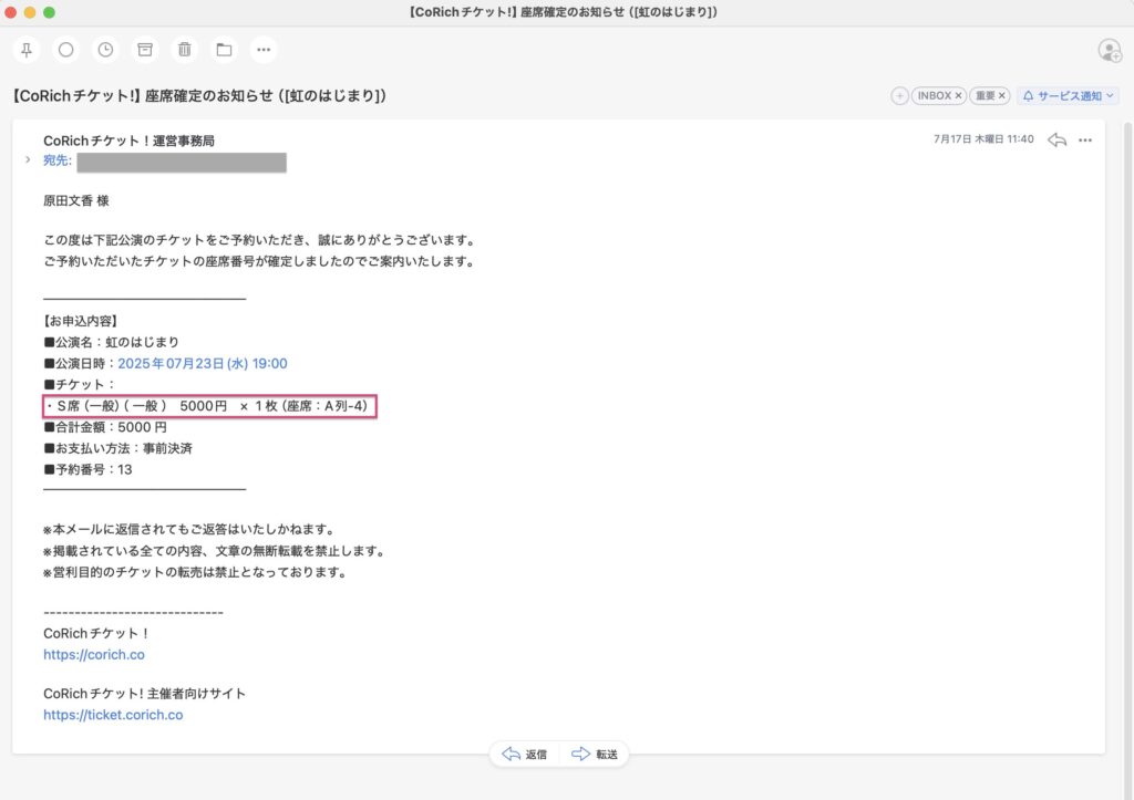 「座席確定メール一括送信」をクリックすると、お客様には以下のようなメールが届き、ご自身の座席番号を確認できます。
