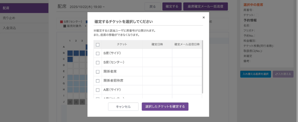同様にして、すべての座席の調整が完了したら、配席を最終確定します。座席の確定は、チケットごとに行うことが可能です。