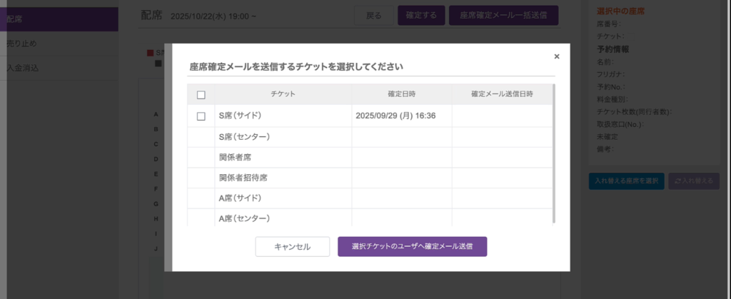 お客様に座席番号を通知するメールを送信します。このステップは【公演基本設定で、座席番号の表示を「座席確定時」としている場合】のみ実施してください。