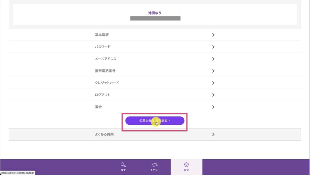 - 設定ページが表示されたら、「公演主催者 管理画面へ」という紫色のボタンをタップします。